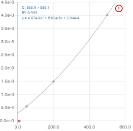 Un clic sur un chromatogramme permet d’afficher le graphe de calibration de l’analyse dans le Panneau Calibration (le texte