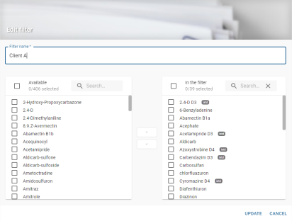 Par défaut, toutes les molécules de type ISTD sont présélectionnées afin de les ajouter directement au filtre. Elles sont représenté via le badge