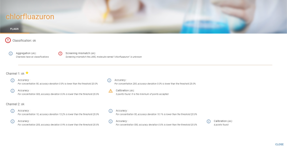 Certaines tables ont une colonne « Flags » qui est représentée par un pictogramme qui représente le niveau du flag le plus sévère présent pour le composé :